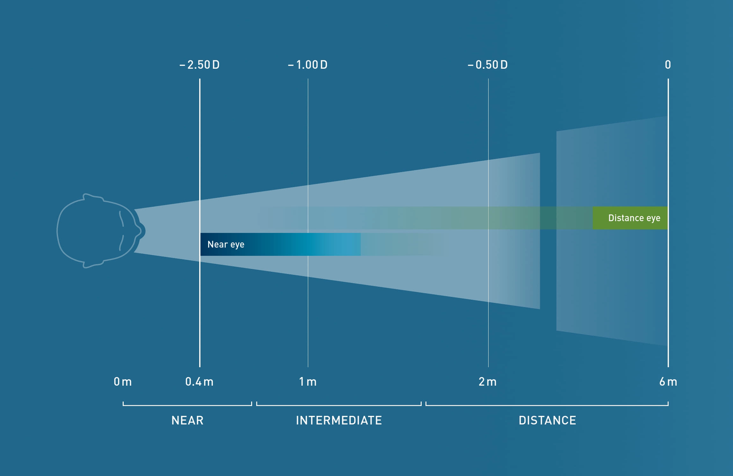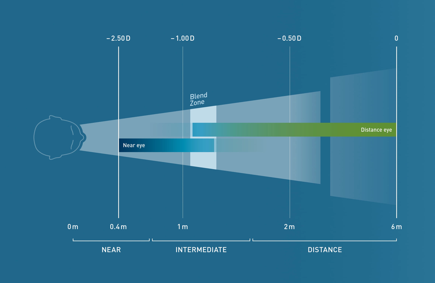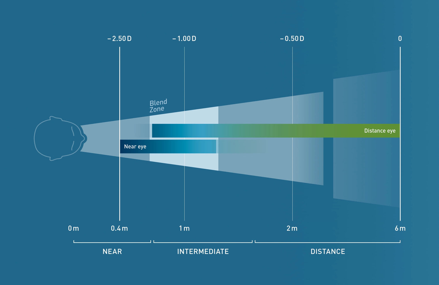 One eye is 100% focused on distance vision. Depth of focus is induced in the near eye only.